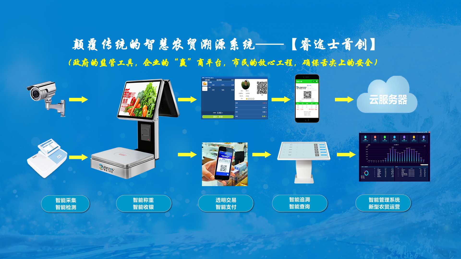 創(chuàng)新實(shí)現(xiàn)了【智慧農(nóng)貿(mào)溯源管理系統(tǒng)】與【智能稱重收銀】一體化解決方案,集市場(chǎng)管理、運(yùn)營(yíng)管理、溯源追溯、智能收銀大數(shù)據(jù)運(yùn)用于一體,硬件、軟件與管理系統(tǒng)完美結(jié)合。適用于農(nóng)批、農(nóng)貿(mào)市場(chǎng)蔬菜、生鮮、水果、水產(chǎn)、肉類(lèi)、熟食等稱重和非稱重銷(xiāo)售;由于采用一體化設(shè)計(jì),解決了傳統(tǒng)農(nóng)貿(mào)市場(chǎng)無(wú)法實(shí)現(xiàn)的信息化、智能化、可追溯的管理問(wèn)題;使稱重、收銀、追溯、管理、更透明、公正、安全,讓顧客無(wú)后顧之憂,給管理工作帶來(lái)極大的便捷與高效,對(duì)國(guó)內(nèi)農(nóng)產(chǎn)品行業(yè)的發(fā)展、農(nóng)產(chǎn)品流通管理起到了典范作用。 【睿途士首創(chuàng)】顛覆傳統(tǒng)的“智慧農(nóng)貿(mào)市場(chǎng)系統(tǒng)”,解決了傳統(tǒng)農(nóng)貿(mào)系統(tǒng)單一安卓掛屏,昂視不方便看、不直觀、無(wú)互動(dòng)性,傳輸信息不齊全、不穩(wěn)定的問(wèn)題,也解決了按鍵電子秤商品難找、商品代碼難記、按鍵操作不靈活、支付不智能,對(duì)收銀管理、銷(xiāo)售商品、菜名、菜價(jià)、打折、優(yōu)惠、會(huì)員、線上下單、采購(gòu)等無(wú)法實(shí)現(xiàn)實(shí)際菜品交易和追溯等問(wèn)題。 更具顛覆性的是睿途士智慧系統(tǒng)擁有三大管理平臺(tái)(市場(chǎng)管理平臺(tái)、總部運(yùn)營(yíng)管理平臺(tái)、商戶后臺(tái)管理平臺(tái))、一個(gè)可視操作前臺(tái)和三大追溯功能,讓遠(yuǎn)程管理、數(shù)據(jù)傳輸、人機(jī)互動(dòng)、智能控制、移動(dòng)支付、大數(shù)據(jù)、互聯(lián)通信、云端存儲(chǔ)、人工智能、智能城市、電子定位、智能收銀等功能得以實(shí)現(xiàn)。